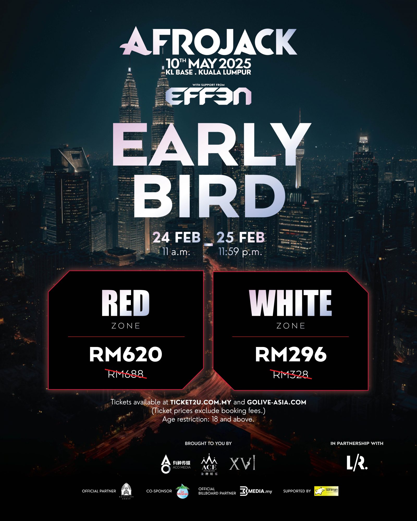 《AFROJACK Live in Kuala Lumpur 2025》将在5月10日,KL BASE 盛大开演,早鸟票(10%优惠)将于2月24日(星期一)上午11点至2月25日(星期二)晚上 11:59 发售。普通门票将于2月26日(星期一),上午11点整,于 ticket2u.com.my 和 golive-asia.com 正式开票。