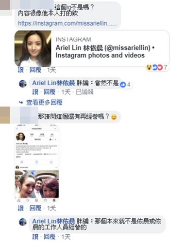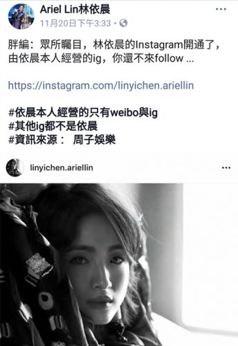 脸书粉丝团“Ariel Lin林依晨”近日发文“众所瞩目,林依晨的Instagram开通了,由依晨本人经营的ig,你还不来follow”,本该欣喜若狂的粉丝却充满疑惑,并留言附上IG帐号“@missariellin”截图留言,询问“这个ig不是吗?内容很像本人打的”,对此小编回应“那个本来就不是依晨或依晨工作人员经营”,这才让粉丝惊呼:从头到尾都追错人了。