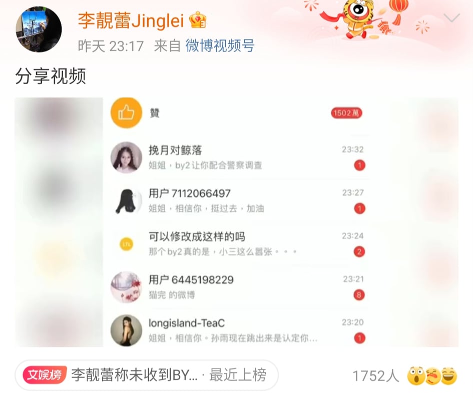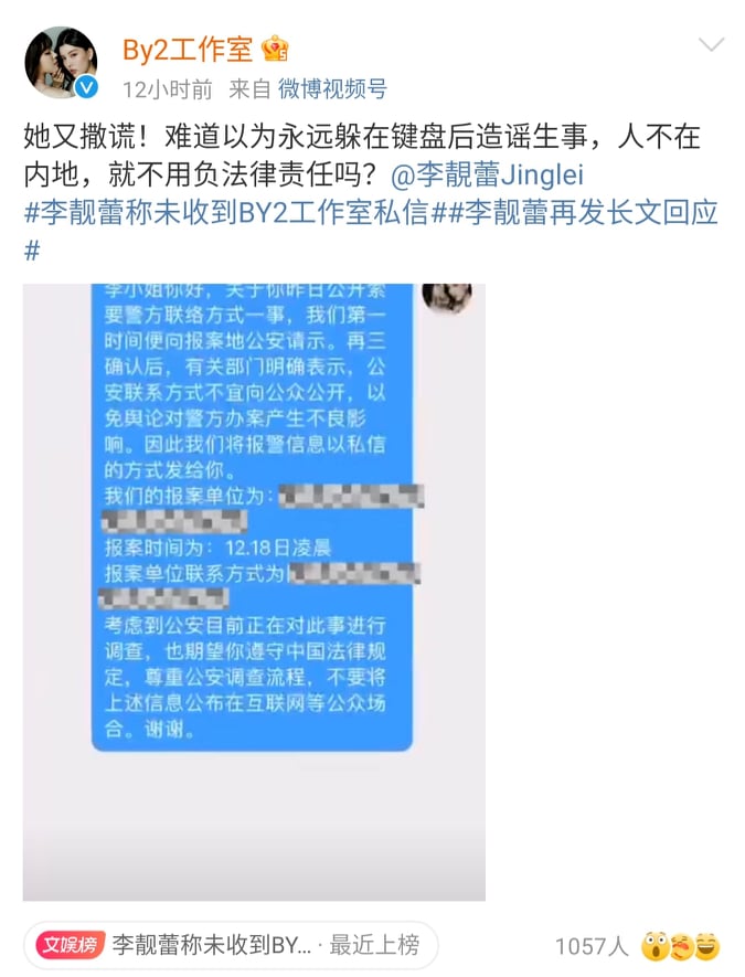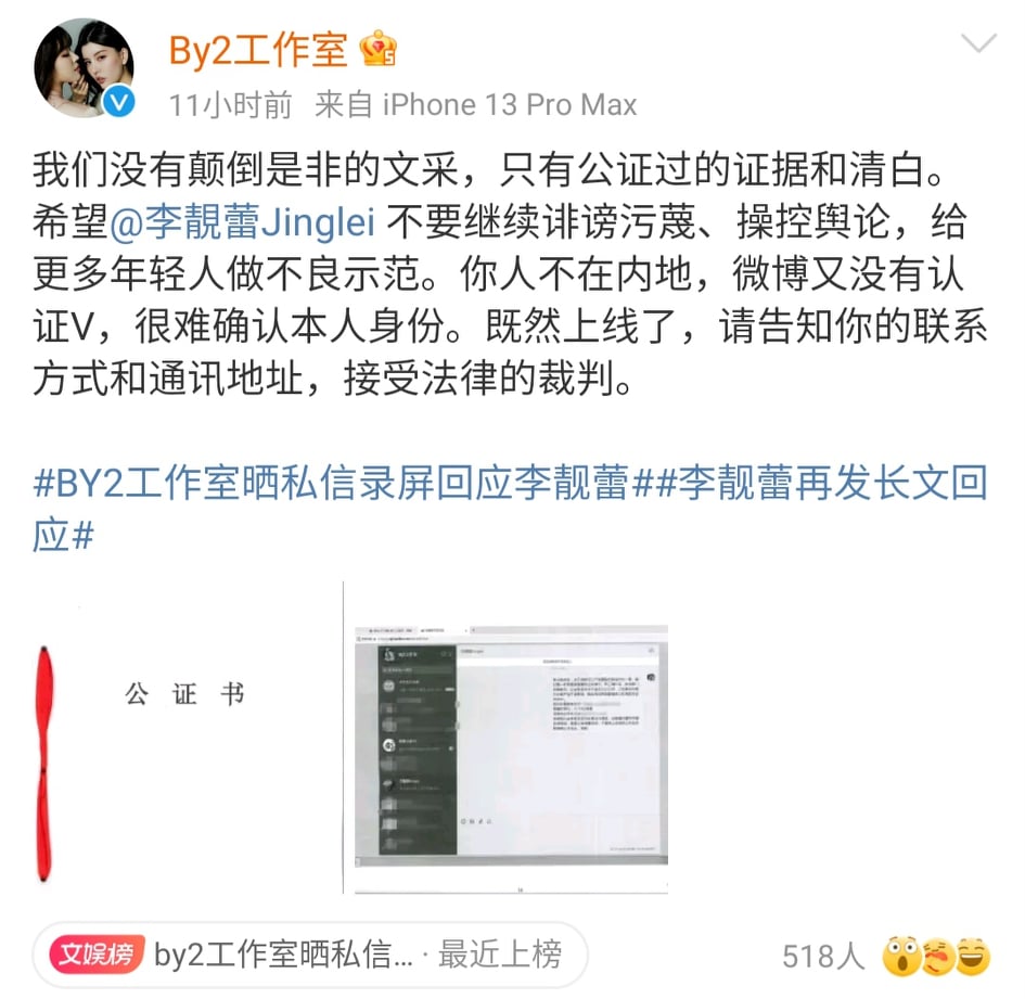李靓蕾回应未收By2私信 By2晒录屏证据 12 Jan , 2022 | 娱乐前线 这场属于李靓蕾和By2Yumi的小三风波再次开战! 李靓蕾晒出私信录屏,表示并未收到BY2工作室发来的报案公示。随后,BY2工作室也晒出录屏,回应:“她又撒谎!难道以为永远躲在键盘后造谣生事,人不在内地,就不用负法律责任吗?” 而在10日BY2工作室喊话李靓蕾:“从李小姐特地公开索要警方联系方式到现在,已经过去21天,可警方却迟迟没等到你的联络。人不在内地的李小姐,请配合警方完成关于你造谣诽谤一事的刑事调查与追究。” 分享