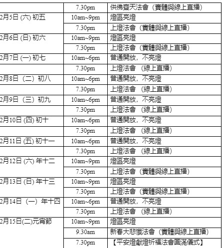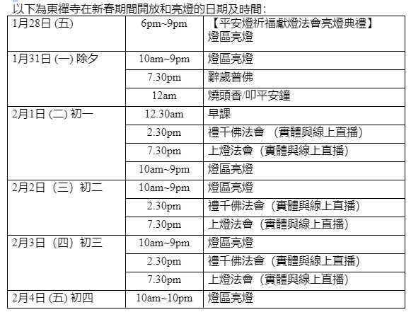 东禅寺新春祈福献灯法会亮灯仪式将于本月28日举行,接着每天开放给大众来寺上香祈福、参加法会和参观美术展,不过,灯区在这期间只亮灯11天(日期见表)。