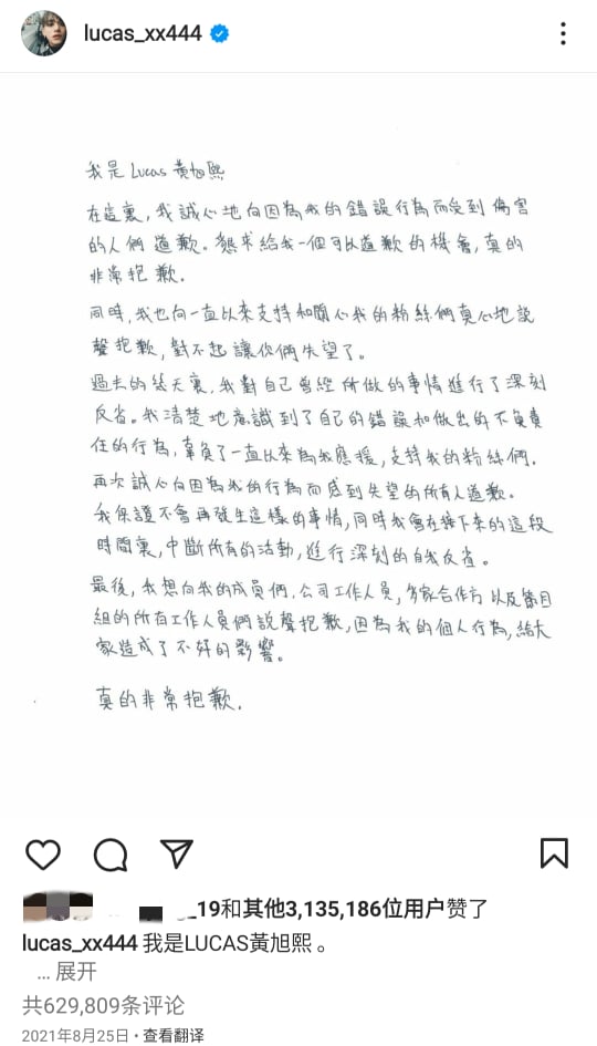 Lucas黄旭熙神隐5个月晒黑白照 试水温网友两级反应 10 Feb , 2022 | 娱乐前线 Lucas黄旭熙去年8月被前女友爆出渣男罪状,神隐5个月后昨晚突然在IG晒出一张黑白照,被猜测疑似在试水温! NCT兼威神V成员Lucas黄旭熙一直是组合中的大势成员之一,不料在去年被前女友爆出多宗渣男行为瞬间从神坛掉落,NCT2021回归以及威神V出道三周年直播都不见他的踪影。 不料就在昨日他IG晒出一张黑白色的海景照,疑似在试水温回归,对此粉丝也呈现出两级反应,有的开心表示终于见到他的出现,有的依然无法原谅他的行为,扬言要他退团! 分享