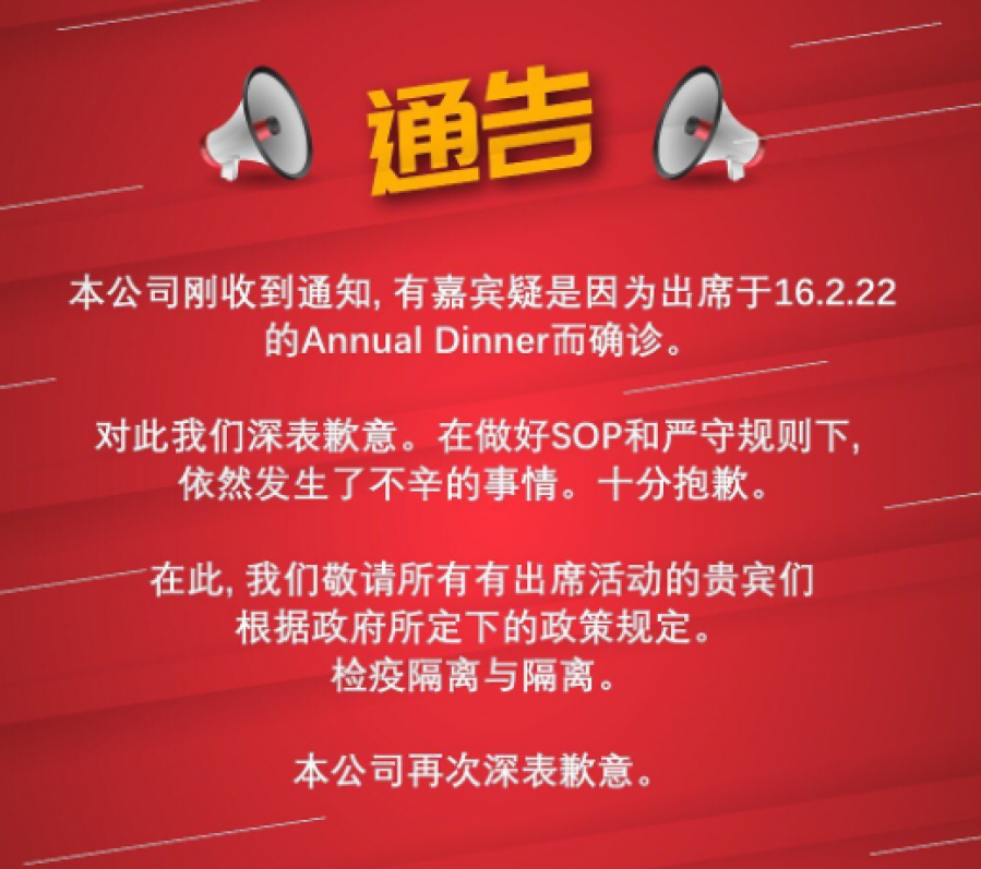 该网红经纪公司发通告写道:”本公司刚收到通知, 有嘉宾疑是因为出席于16.2.22的Annual Dinner而确诊。”据了解,该周年晚宴广邀大马众多网红出席,也邀约低清K佬及DJ Amber Na担任表演嘉宾。