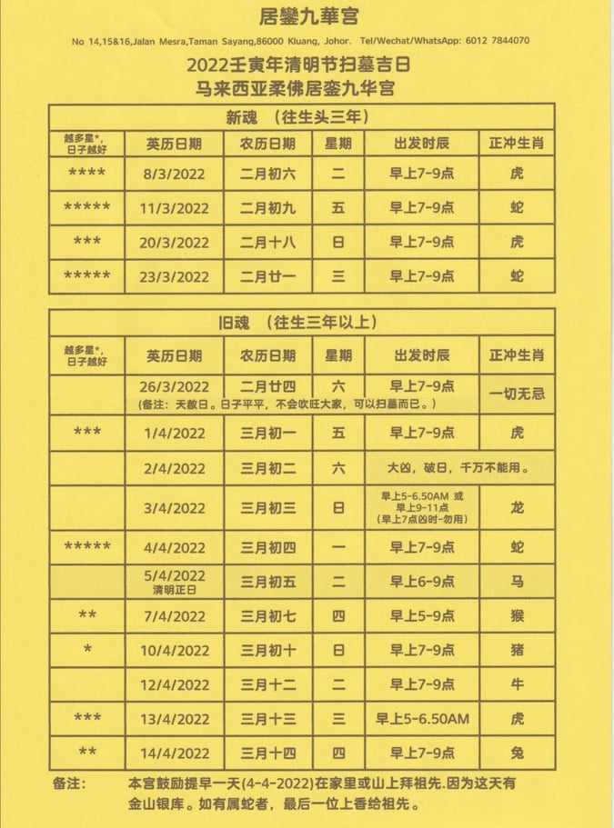 清明节扫墓吉日表 4月2日是大凶 7 Mar , 2022 | 吃喝玩乐 清明节是华人传统最重要的扫墓祭祀节日!今年,清明节正日落在2022年4月5日(星期二)!根据柔佛居銮九华宫的扫墓吉日表,建议大家提前一天在家或山上祭拜祖先,因为这天有金山银库,如有属蛇者,最后一位上香给祖先! 必须注意的是,4月2日(星期六)是大凶,不宜扫墓!大家在选择日子的时候,记得不要挑选这天! 分享
