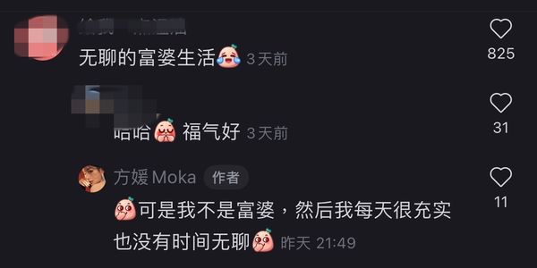 方媛晒出一段对嘴唱歌影片,影片中可看到她放下飘逸长发,一手托住头,少女感十足,开心说:“我的黑直发,最近把头发养厚了一点点。”留言区一片称赞,但也有人酸:“无聊的富婆生活”,方媛亲自下海回怼:“可是我不是富婆,然后我每天很充实也没有时间无聊。”此外有人问:“为啥感觉她过得一点也不开心。”她也轻松回:“你都说了那是你的感觉了。”高EQ回应获得赞赏。