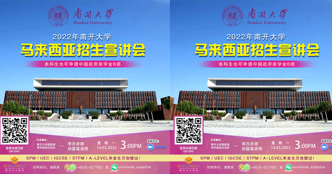 寰宇专才基地将于3月14日(星期一)下午3时线上举办“2022南开大学马来西亚招生宣讲会”, 协助有意到中国深造的学生及家长了解详情。