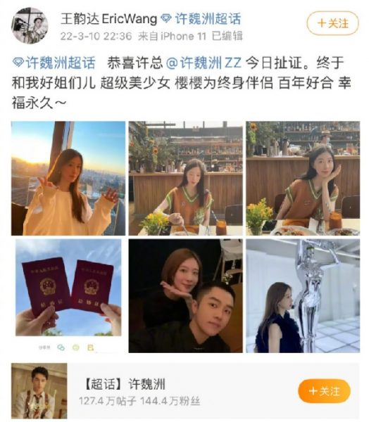 凭BL剧《上瘾》走红的中国男星许魏洲昨天13:14无预警晒出结婚证书宣布结婚,喜讯震撼各界。因为他对恋情保护到家,女方的身分受到许多网民的猜测,不料妻子仍被爆出是高中学姐,低调交往4年修成正果,女方友人还主动晒出照片,而且同时发表在许魏洲超话,虽让吃瓜群众终于看到新任许太太的高颜值,然而此举却遭批是猪队友,辜负了许魏洲欲保护老婆隐私的初衷。