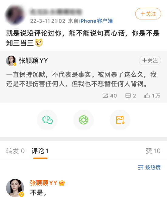 否认知三当三!张颖颖酸汪小菲“抛妻弃子” 12 Mar , 2022 | 娱乐前线 张颖颖发博回应此前与汪小菲被拍牵手事件:“一直保持沉默,不代表是事实。被网暴了这么久,我还是不想伤害任何人,但我也不想替任何人背锅。” 当网友提出质疑是不是知三当三时,张颖颖直接回复不是。有狗仔拍到汪小菲张颖颖先后到达上海视察新店。吃完晚饭后,汪小菲有几分醉意,张颖颖则负责招呼朋友,路上汪小菲还跟张颖颖闲聊,并拉起女方的手十指紧扣。 分享