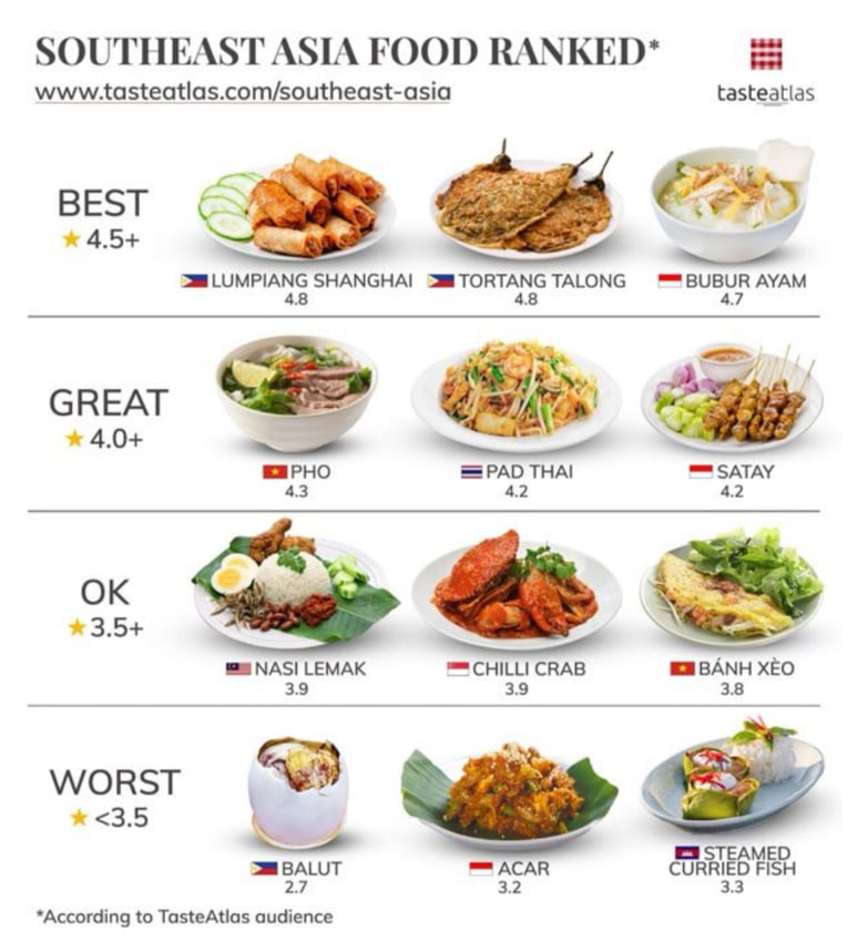 当中,菲律宾春卷(Lumpiang Shanghai)、茄子煎蛋(Tortang Talong)和印尼的鸡肉粥(Bubur Ayam)各获4.8分和4.7分,被列为“Best!越南河粉(Pho)、泰式炒粉(Pad Thai)和新加坡沙爹(Satay)则获4.3分至4.2分,属于“Great”!椰浆饭和新加坡辣椒螃蟹,则获得3.9分,属于“OK”!