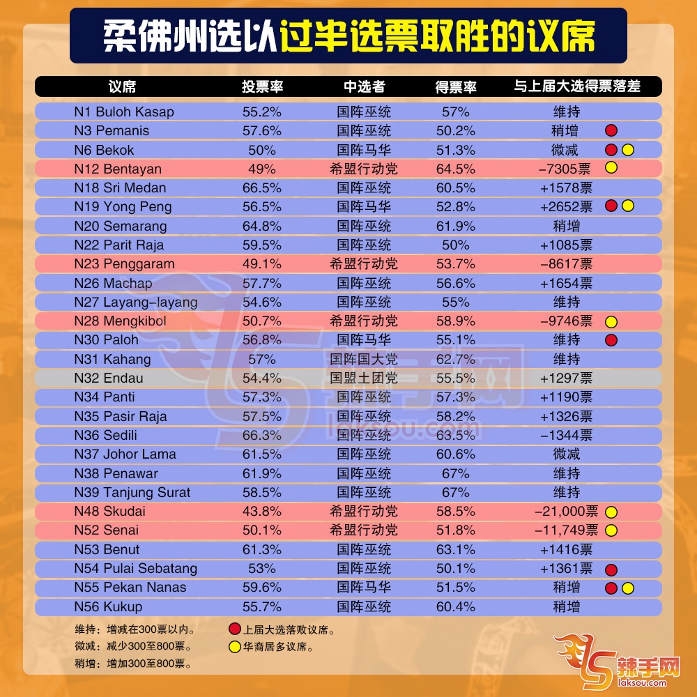 【柔佛选战解析1】柔佛56个州议席,只有27席是”名副其实”的获胜,中选者票得票率达到50%以上;同时,16席得票也更胜上届大选,其中以马华在永平增加了2652张选票居首。