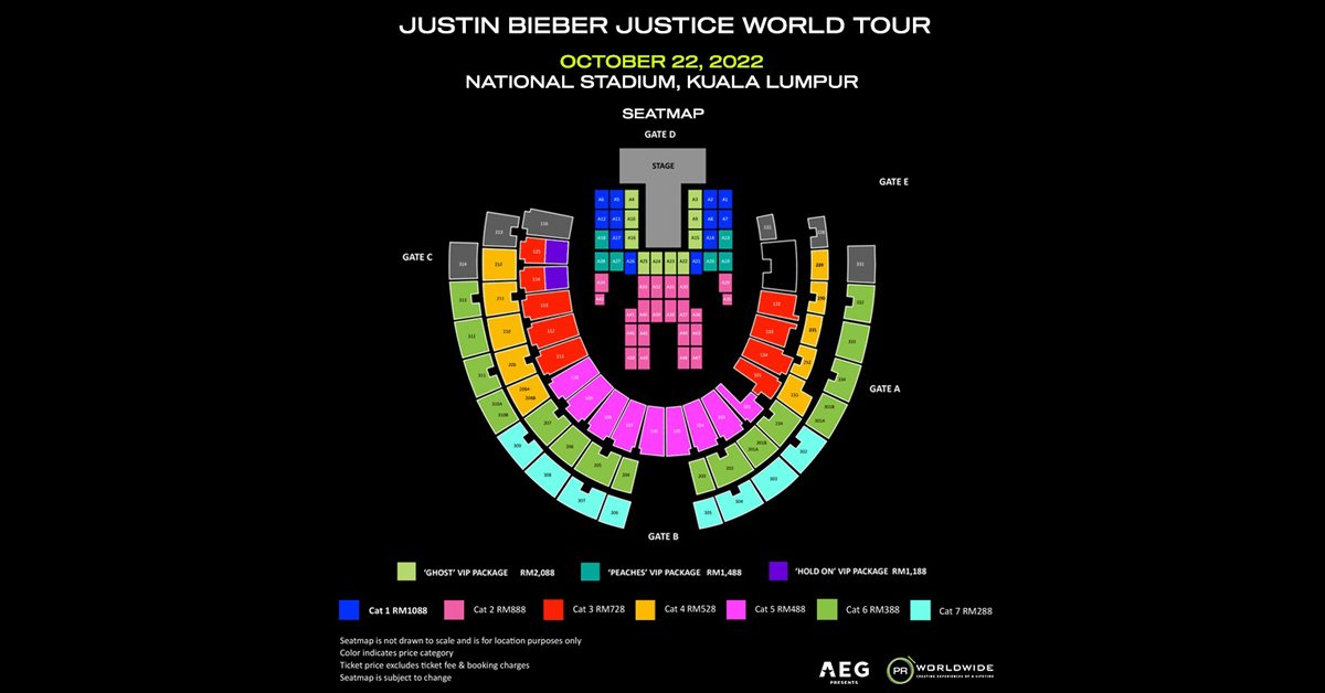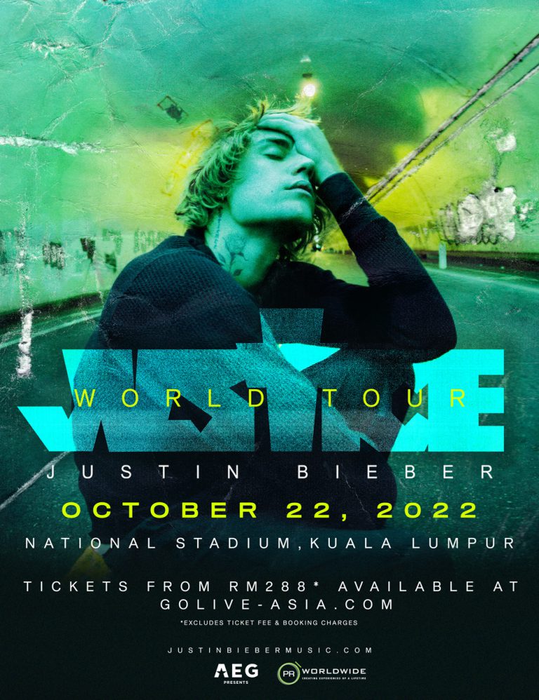 贾斯汀比柏的世界巡回演唱会《Justice World Tour》原定2020年5月14日开跑,却受疫情影响而延后,直到今年2月18才正式重启,大马站则订于10月22日在吉隆坡武吉加里尔国家体育场(Bukit Jalil National Stadium)进行,其演唱会门票共分10种票价,价格从288至2088令吉不等,并将于3月31日早上11时在https://golive-asia.com/公开发售。