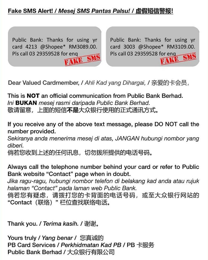 大众银行发出虚假短信警报 小心提防诈骗 24 Mar , 2022 | 吃喝玩乐 大众银行用户注意!若收到类似下图的短信讯息,切勿拨打信息所提供的电话号码! 根据大众银行通过电邮发出的虚假短信警报,下图的短信不是大众银行正式通讯的方式! 据了解,大众银行的短讯模式通常以大众银行的缩写PBB或PIBB为开头,信息包括交易的日期和时间,但假信息是没有这些资讯!同时,你只要在谷歌输入相关号码,就会看到此号码列入垃圾电话(Junk Call)! 若大家有任何疑虑,可以拨打银行卡背面的电话号码,或者到大众银行网站的“联络”栏位查找联络电话! 分享