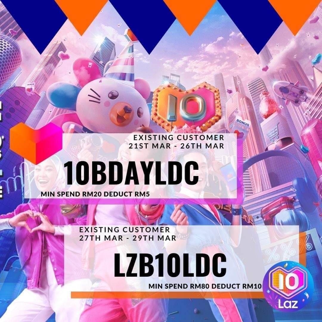 经常使用Lazada 网购的你,不要错过这项促销!付款前输入指定促销码,可获得折扣!从即日起至3月26日,消费满RM20并输入 #10BDAYLDC可获得RM5折扣!从即日起至3月29日,消费满RM80并输入 #LZB10LDC 可获得RM10折扣!