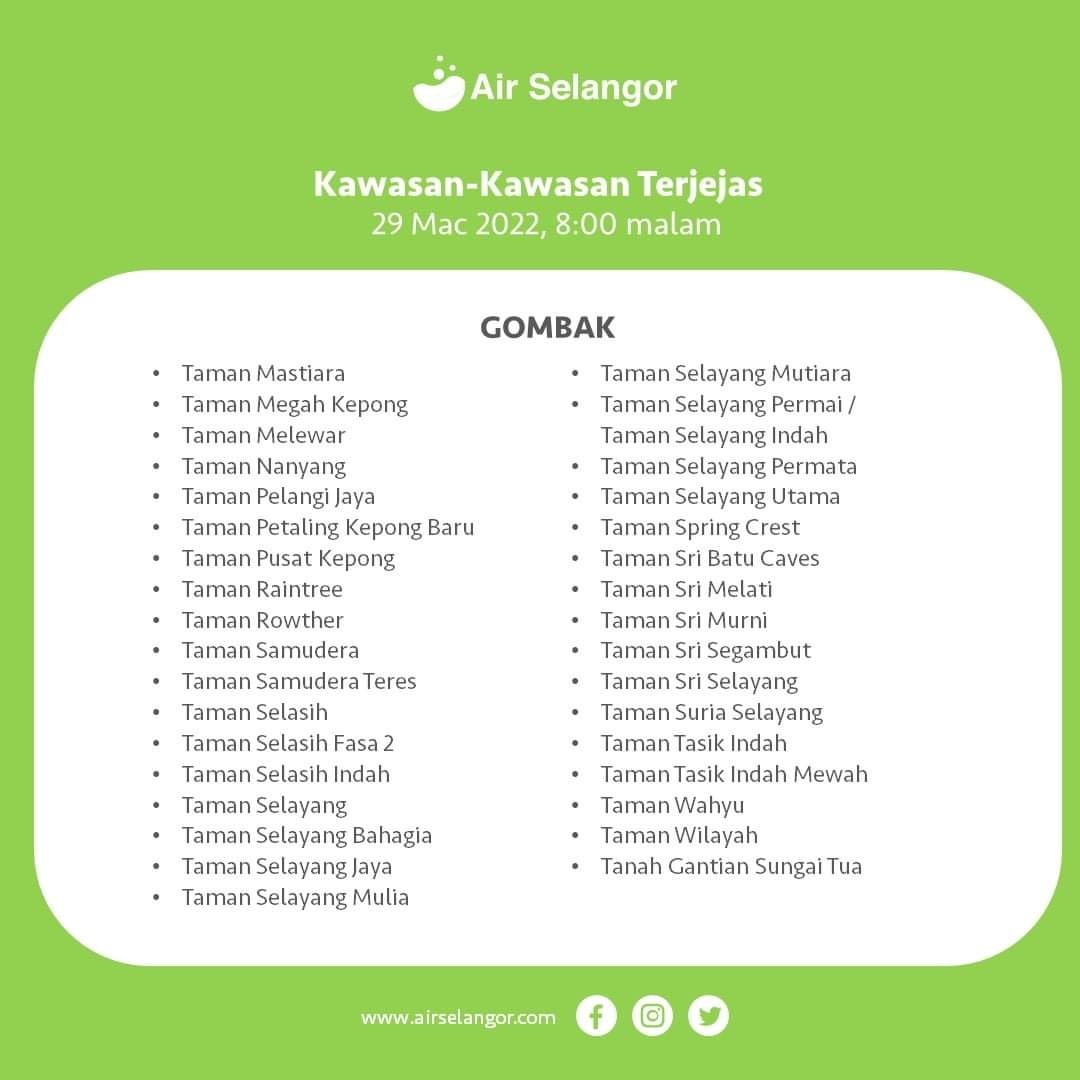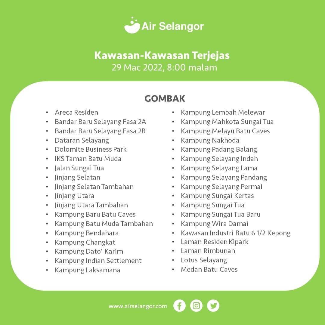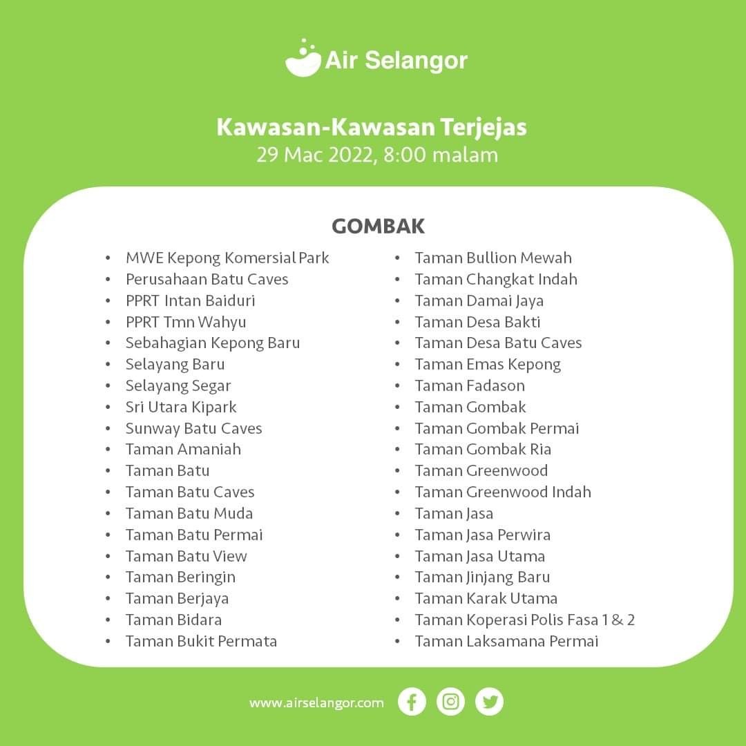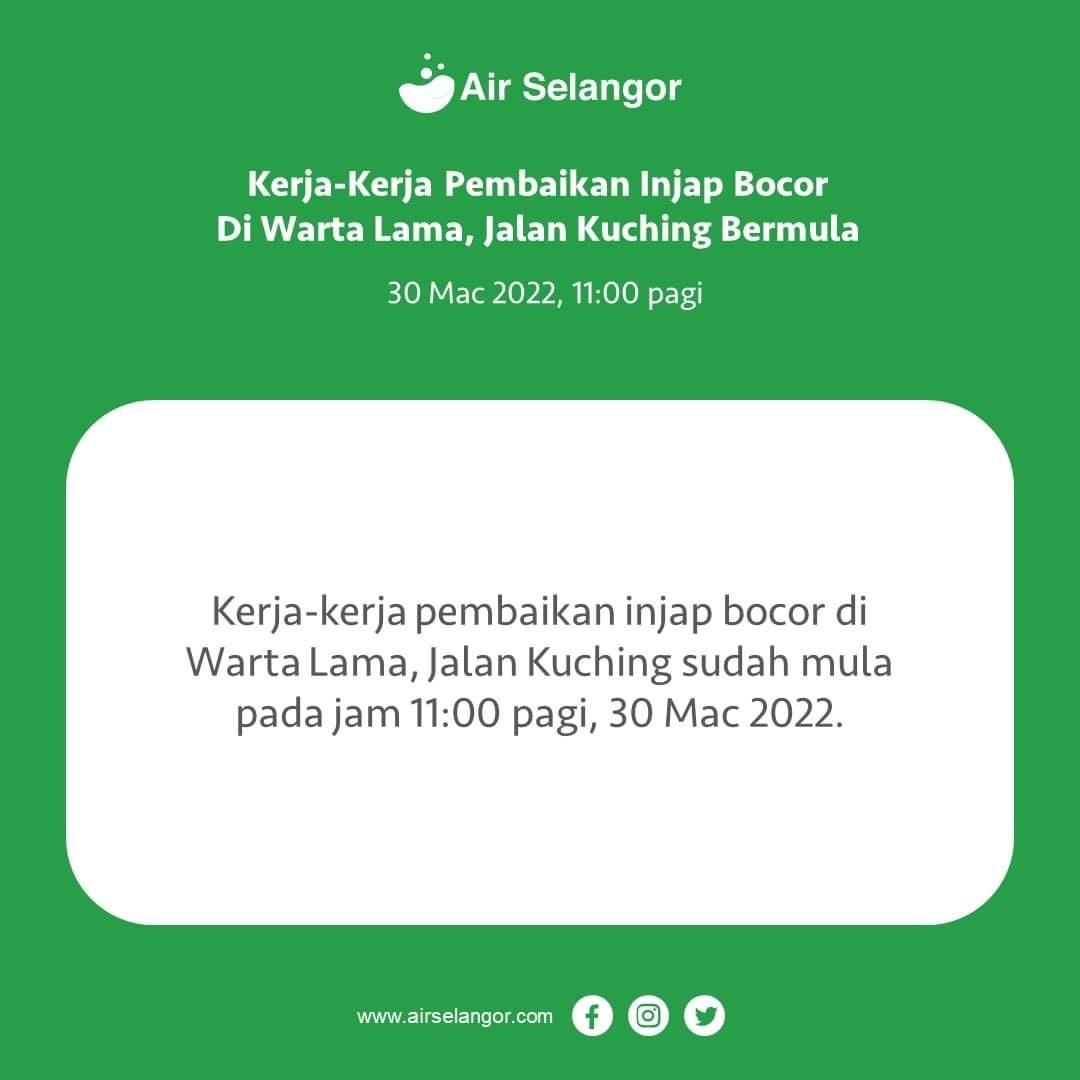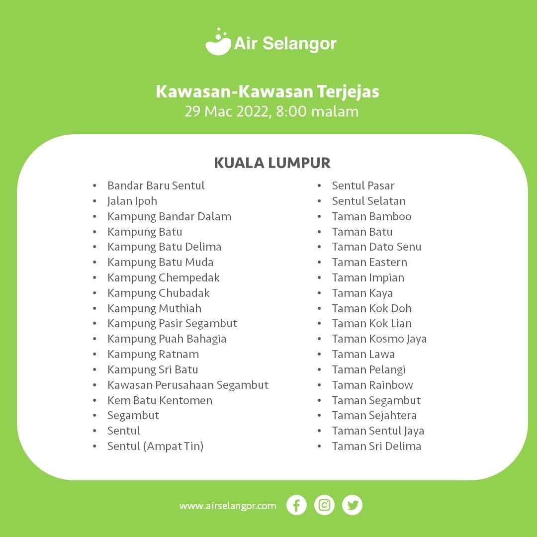 3月30日这些地区将会制水一天 30 Mar , 2022 | 吃喝玩乐 居住这些地区的朋友注意!3月30日将会制水一天! 根据雪兰莪水供管理公司(Air Selangor)发出的最新消息,吉隆坡古晋路Warta Lama的闸阀出现破损,修复工程将在3月30日(11am)展开! 受影响的主要在吉隆坡和鹅唛的144个地区,民众将面临断水的问题!该公司预计将会在3月30日晚上9pm完成,之后会逐步恢复水供!水供预料将会在3月31日早上9am完成恢复! 分享