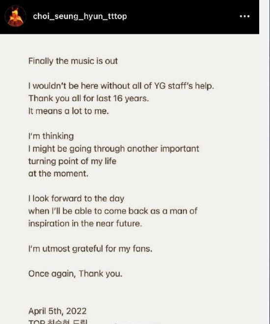 T.O.P写道:“我现在正在经历人生另一个重要的转折点,期待未来有一天,我能变成一个带给大家启发的人回来。”强调若没有“YG娱乐”的协助,自己不会站在这,谢谢大家过去16年的支持、对粉丝只有万分感谢。T.O.P该段发文被网友解读成“告别文”,纷纷留言盼他未来不要放弃音乐创作,有朝一日能再归队BIGBANG。