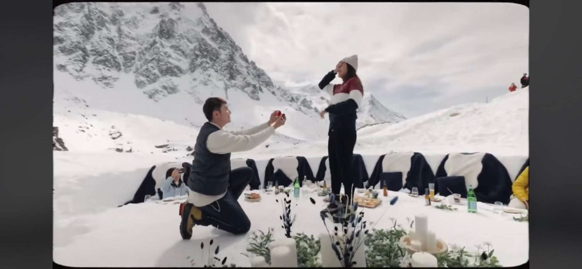 大马艺人朱浩仁与网红女友Gladish陈祤琹交往5年,日前两人因工作飞往阿尔卑斯山出席品牌活动,他在漂亮的雪山前以及同行好友的见证下浪漫求婚,让女友又惊又喜感动点头答应。