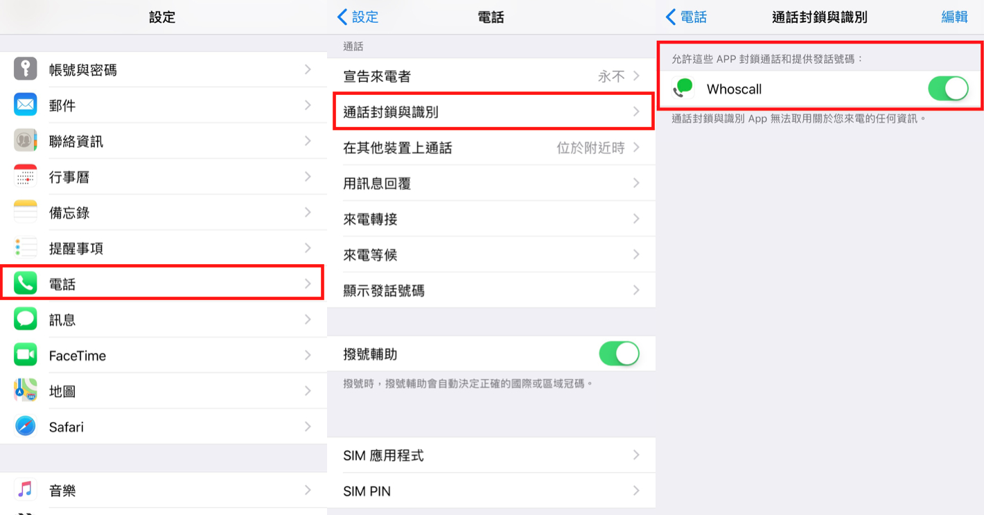 下载完Whoscall后,我们先到“设定”>“电话”>“通话封锁与识别”的地方,在Whoscall打开即可。