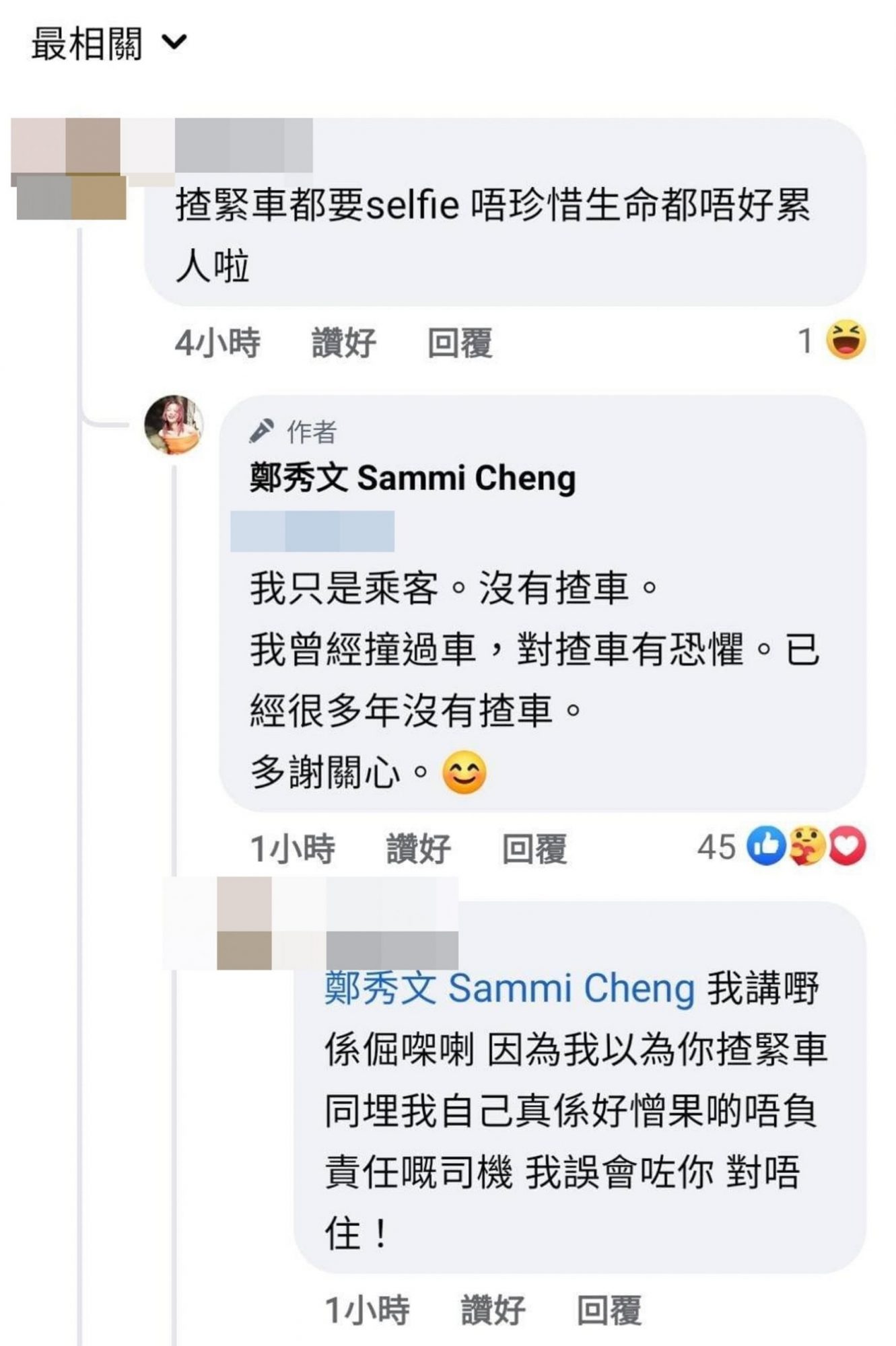 由于香港是右驾,加上影片中可看出车子正在行进中,因此才引发该网民误解郑秀文边开车边自拍,在郑秀文回击之后,便有其他网民跳出来帮忙解释,认为应该是自拍镜头左右翻转,才会让人误会她坐在驾驶座上。目前,郑秀文已经将脸书上搭车兜风的影片删掉。