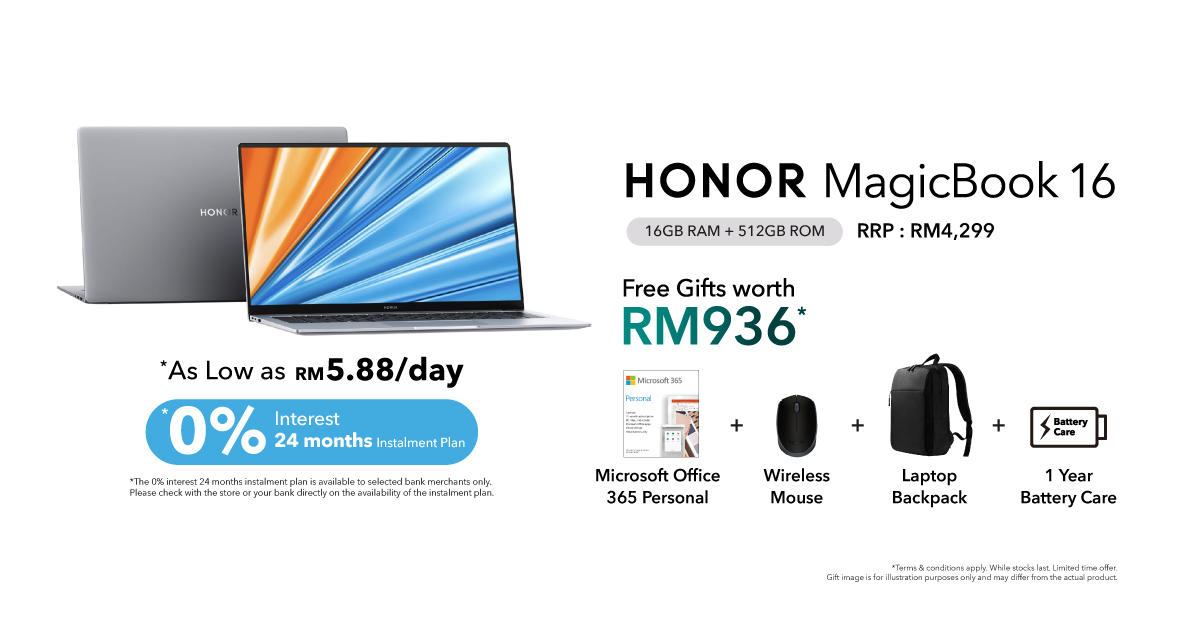 最新发布的HONOR MagicBook 16以高能生产力,引起市场瞩目。AMD锐龙 7 5800H系列处理器,搭配144Hz高刷新率电竞理想屏,以及智能冷却系统,进一步提升这款笔电整体的性能。它备有16GB RAM + 512GB ROM版本,售价为RM 4,299,颜色为太空灰。这款笔电也提供0% 利息24个月分期付款配套,每天只需最低RM5.88*,你便可将笔电带回家。