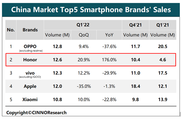 让数字说话!中国调查机构CINNO Research数据显示,HONOR于2022年首季成功逆袭,在中国市场Top 5手机销售排行榜中升至第二,同比增长高达176%!