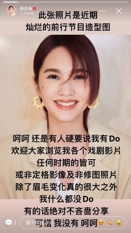 然而尽管杨丞琳亲自出面努力澄清,还是有人不相信她没有整形。她昨天下午又发一次文:“呵呵,还是有人硬要说我有做,欢迎大家浏览我各个戏剧影片,任何时期的皆可,或非定格影像及非修图照片,除了眉毛变化真的很大之外,我什么都没做,有的话绝对不吝啬分享,可惜,我没有,呵呵。”对于传言流露满满无奈。
