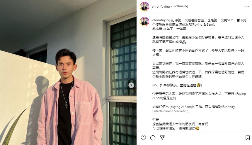 Fuying发长文回忆出道的回忆,“记得第一次踏进录音室,也是第一次见Sam,当下完全没想过会组团出道成为FS(Fuying & Sam)”,他也感谢公司一直给予的许多机会,让组合在出道初期就获得了好成绩。