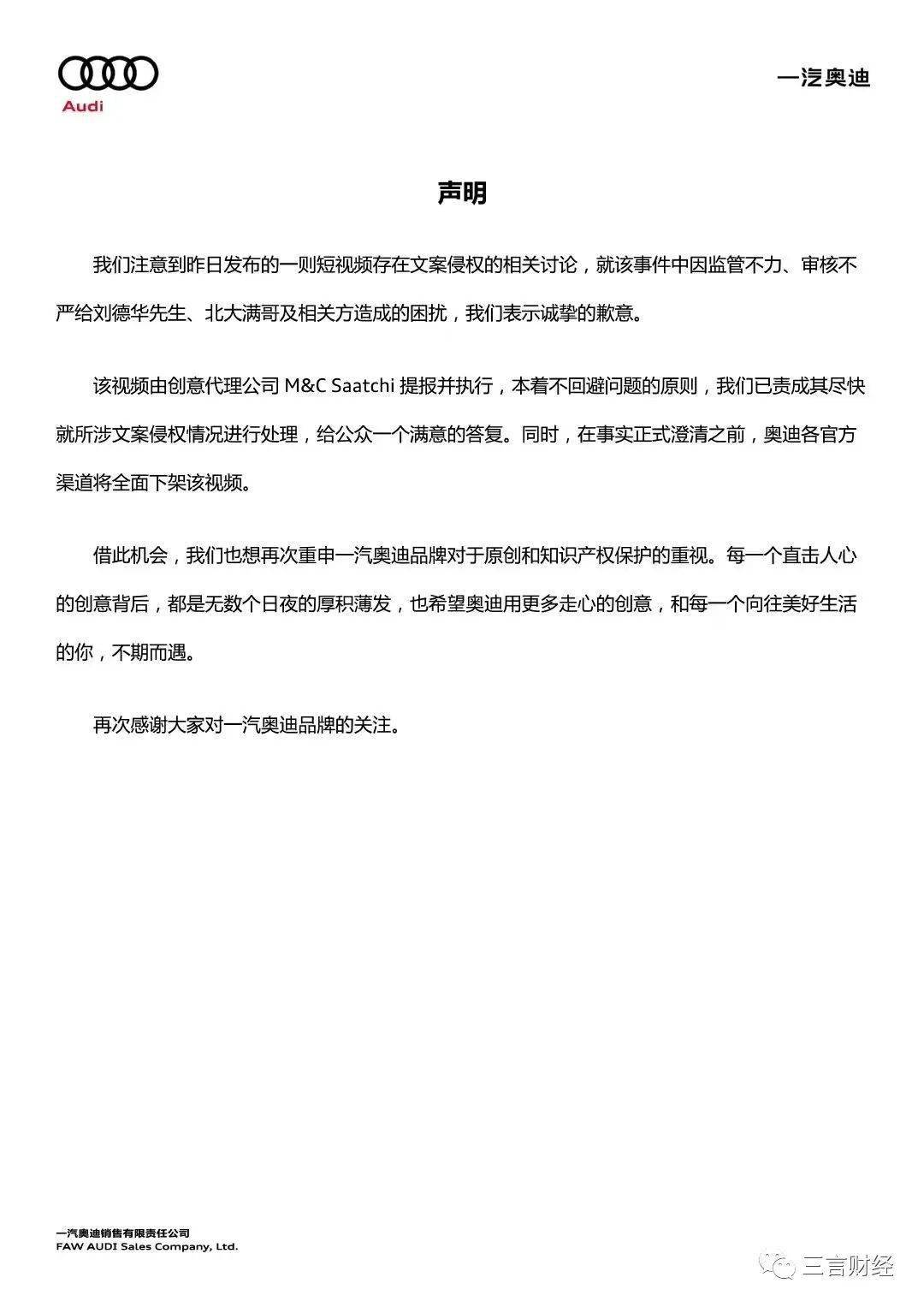 对此,奥迪汽车22日发出声明,针对事件道歉“因监管不当、审核不严给刘德华先生、北大满哥及相关方造成困扰,我们表示诚挚的歉意”。此外,声明中也表示会尽快对于文案侵权情况进行处理,给外界满意答案,在事实澄清前官方会先将所有影片下架。