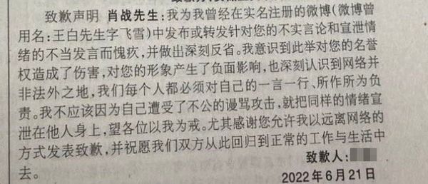李女在道歉文中公开真实姓名、微博帐号名称,坦承曾经借此帐号发表或转发针对肖战的不实言论、宣泄情绪的不当发言,对此感到愧疚,并已深刻反省,“我意识到此举对您的名誉权造成了伤害,对您的形象产生了负面影响,也深刻认识到网路(络)并非法外之地,我们每个人都必须对自己的一言一行、所作所为负责。”