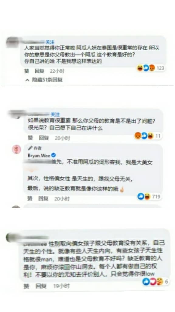 甚至有网友在他照片暗讽说”是你的父母教出一个阿瓜“,对此他并无大怒与网友开骂,反而正面大方的回应对方说:”首先,不准用阿瓜的词形容我,我是大美女。其次,性格偏女性是天生的,跟我父母无关。最后,说的缺乏教育就是像你这样的哦“、”不懂我请不要评论,谢谢你,我不为哗众取宠 女性化自己,全凭自愿“。