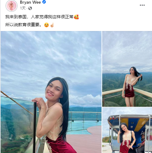 ByranWee经常在网络上反串女装造型,甚至被网友赞美身材比女生还要好,最近他到泰国旅游穿上性感贴身女装大拍美照分享到FB配文:“我来到泰国,人家觉得我这样很正常。所以说教育很重要”,不料再度被网友拿性别开酸他是”阿瓜“。