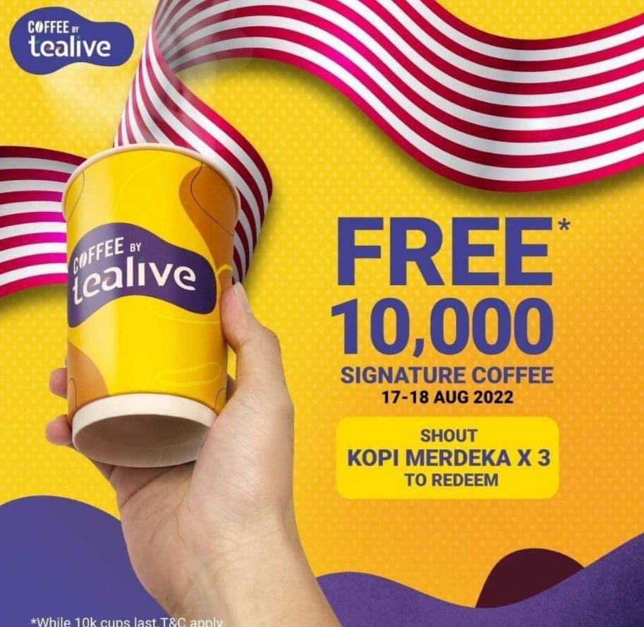 Tealive免费请你喝咖啡 13 Aug , 2022 | 吃喝玩乐 8月真的有超多好康可以领取的!除了麦当劳免费送出折扣劵、国旗,现在Tealive也要免费请你喝咖啡咯! 配合国庆月的到来,Tealive 将在全马分店推出饮料促销!民众只需前往Tealive大喊三声“Kopi Merdeka”,即可免费获得1杯经典咖啡!这项促销将于8月17日和18日推出,只限10,000杯,先到先得!想要领取的朋友,记得mark下时间不要错过了! 分享