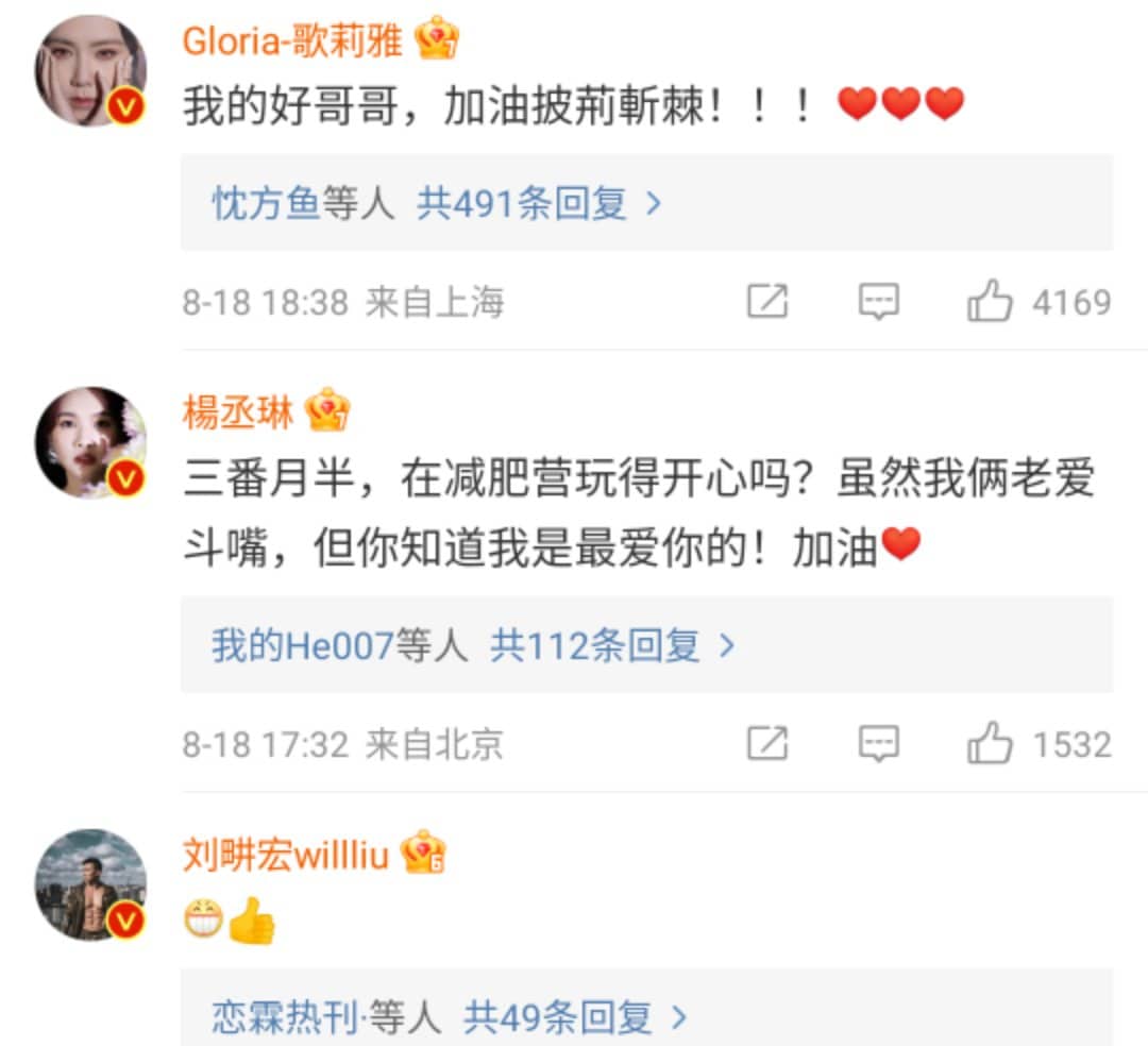 他表示:“其实就是管住嘴,然后练舞练舞练舞,和我的脂肪一起披荆斩棘”,好友杨丞琳转发微博为他加油:“三番月半,在减肥营玩得开心吗?虽然我俩老爱斗嘴,但你知道我是最爱你的!加油。”李荣浩也幽默表示:“太瘦了,腹肌都皱了。”邓紫棋也不忘为潘帅喊“加油”。