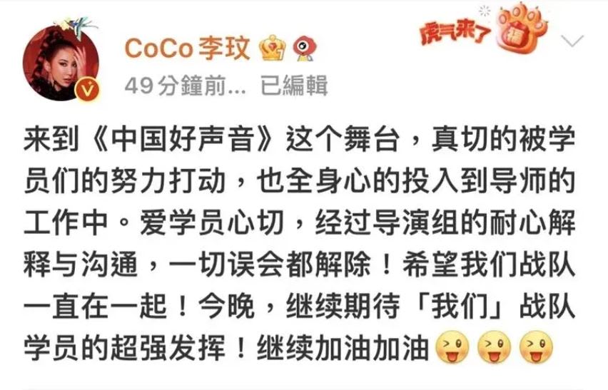 对此,李玟在微博发文回应:“来到《中国好声音》这个舞台,真切的被学员们的努力打动,也全身心的投入到导师的工作中。爱学员心切,经过导演组的耐心解释与沟通,一切误会都解除!”她表示已经跟节目组沟通完毕,请大家期待之后播出的节目,也会继续加油。