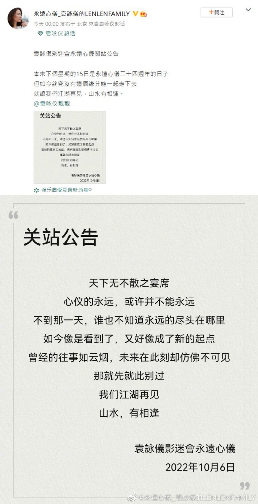 袁咏仪唯一影迷会“永远心仪”在6日宣布关闭,超话粉丝大咖写道:“本来下个星期的15日是永远心仪24周年的日子,但如今终究没有这个缘分能一起走下去,就让我们江湖再见,山水有相逢。”