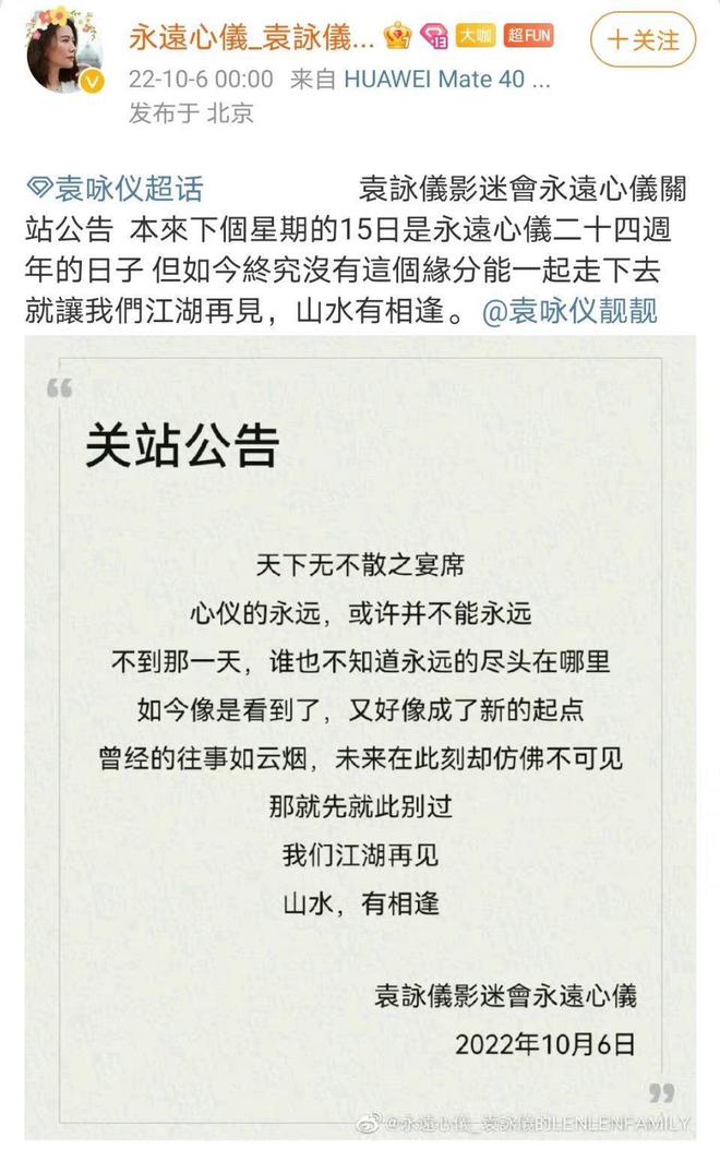 10月6日开站多年的袁咏仪影迷会宣布关站:“本来下个星期的15日是永远心仪二十四周年的日子,但如今终究没有这个缘分能一起走下去。就让我们江湖再见,山水有重逢。”