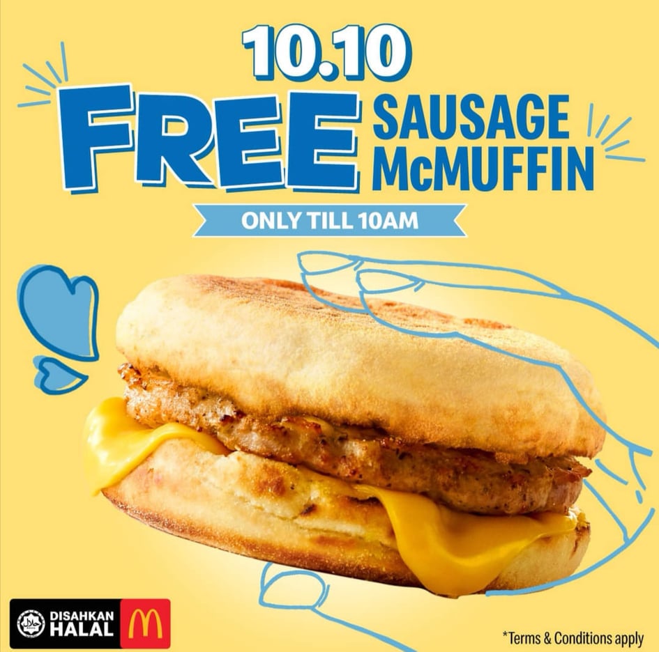 麦当劳免费送Sausage McMuffin 9 Oct , 2022 | 吃喝玩乐 麦当劳免费送Sausage McMuffin,只限10月10日! 麦当劳将在10月10日指定时间(630am至10am),免费送出Sausage McMuffin优惠劵!你可以选择前往分店领取,或者可以通过麦当劳App领取,然后到Drive-Thru兑换! 不过需要注意的是,麦当劳每家分店只会派发200张优惠券,先到先得! 分享