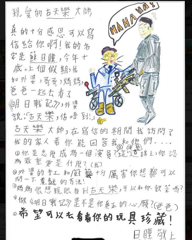 古天乐在昨日踏入52岁生日,他IG开心晒出一名小影迷写给他的亲笔信,文中还对古仔提出了4道问题!