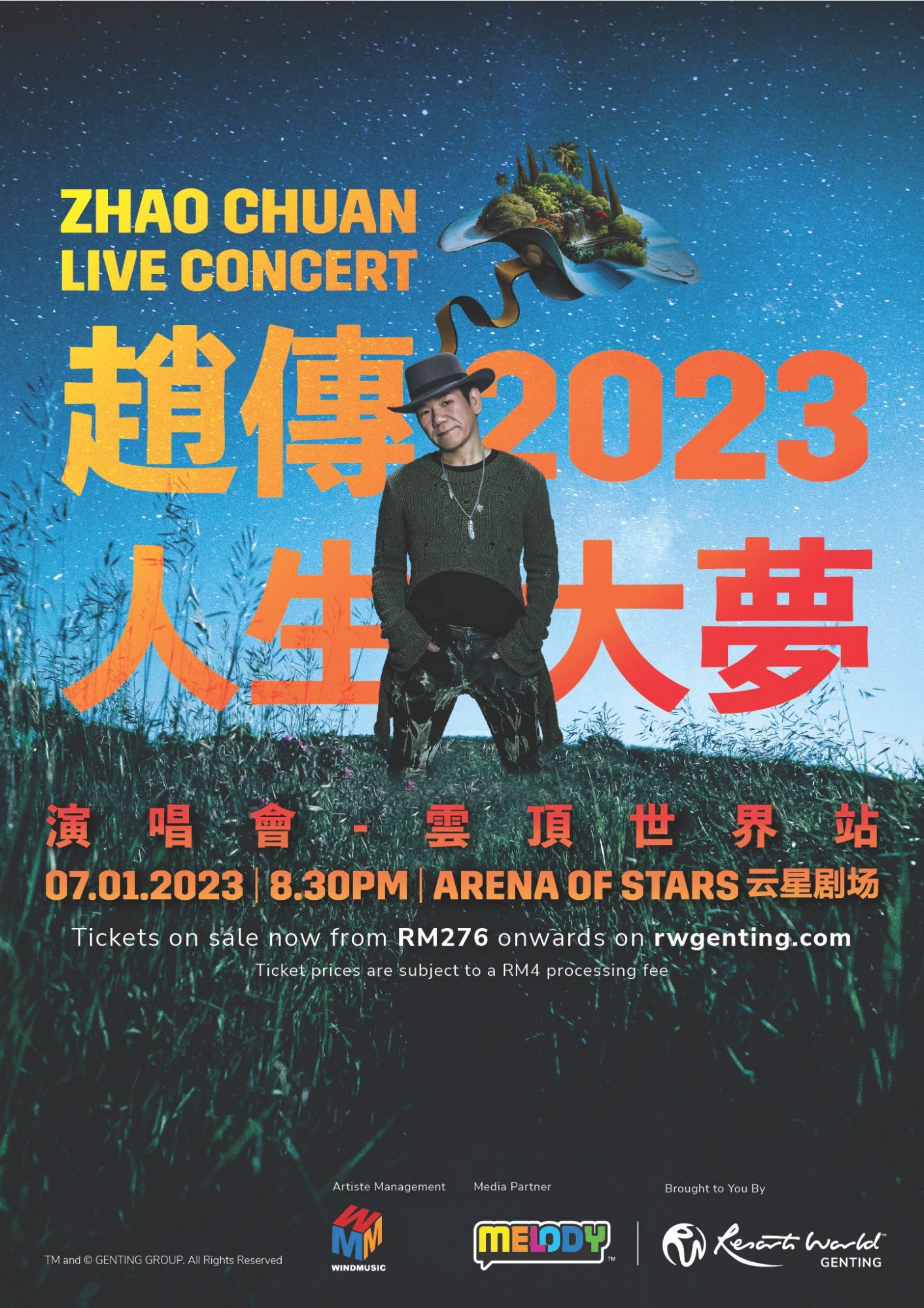 《赵传2023人生大梦演唱会云顶世界站》将于 2023 年 1 月 7 日在云星剧场举行。门票现已开始发售,价格分别为 796令吉(VIP)、546 令吉(PS1)、376令吉(PS2)及 276 令吉(PS3);票价未包括 4 令吉手续费。凡通过云顶积分、信用卡或现金购票的云顶云尊卡会员将获得 10%折扣,(适用于 VIP、PS1 及 PS2 票位)。