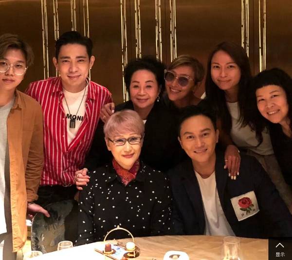 合照中坐在中间的紫色头发的就是张智霖的妈妈,据说这天是张智霖妈妈的生日,大家一起为他妈妈庆生。