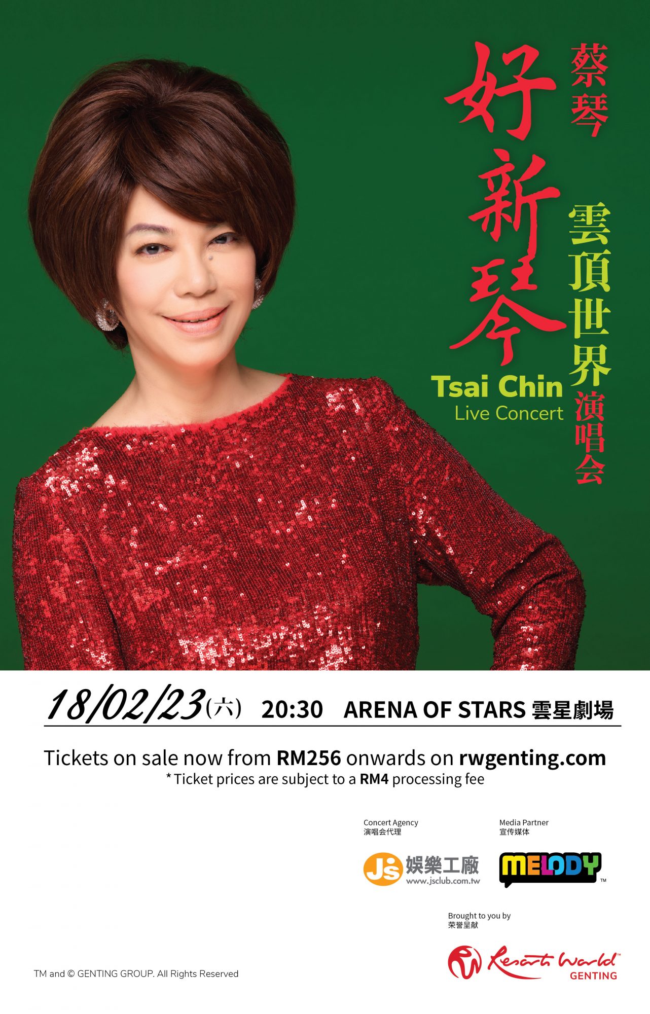 《蔡琴好新琴 雲頂世界演唱會》将于 2023 年 2 月 18 日晚上在云星剧场拉开帷幕,门票现已开始发售,价格分别为 746 令吉(VIP)、536 令吉(PS1)、356 令吉(PS2)及 256 令吉(PS3);票价未包括 4 令吉手续费。用云尊卡积分、信用卡或现金购票的云顶云尊卡会员将获得 10%折扣,(适用于 VIP、PS1 及 PS2 票位)。欲订购门票或查询更多演唱会详情,请浏览网站 www.rwgenting.com。
