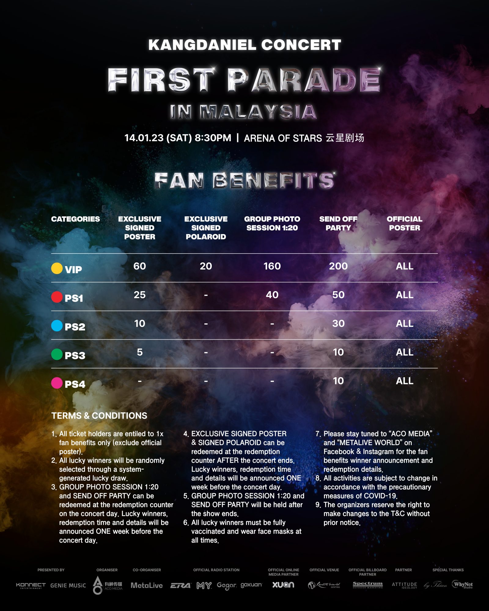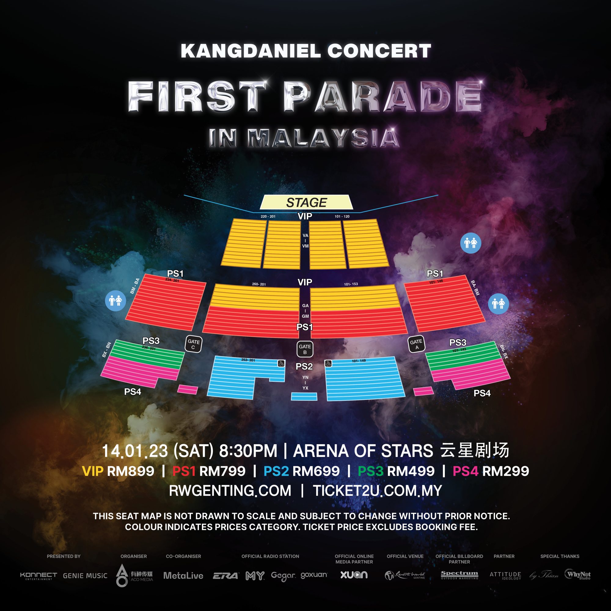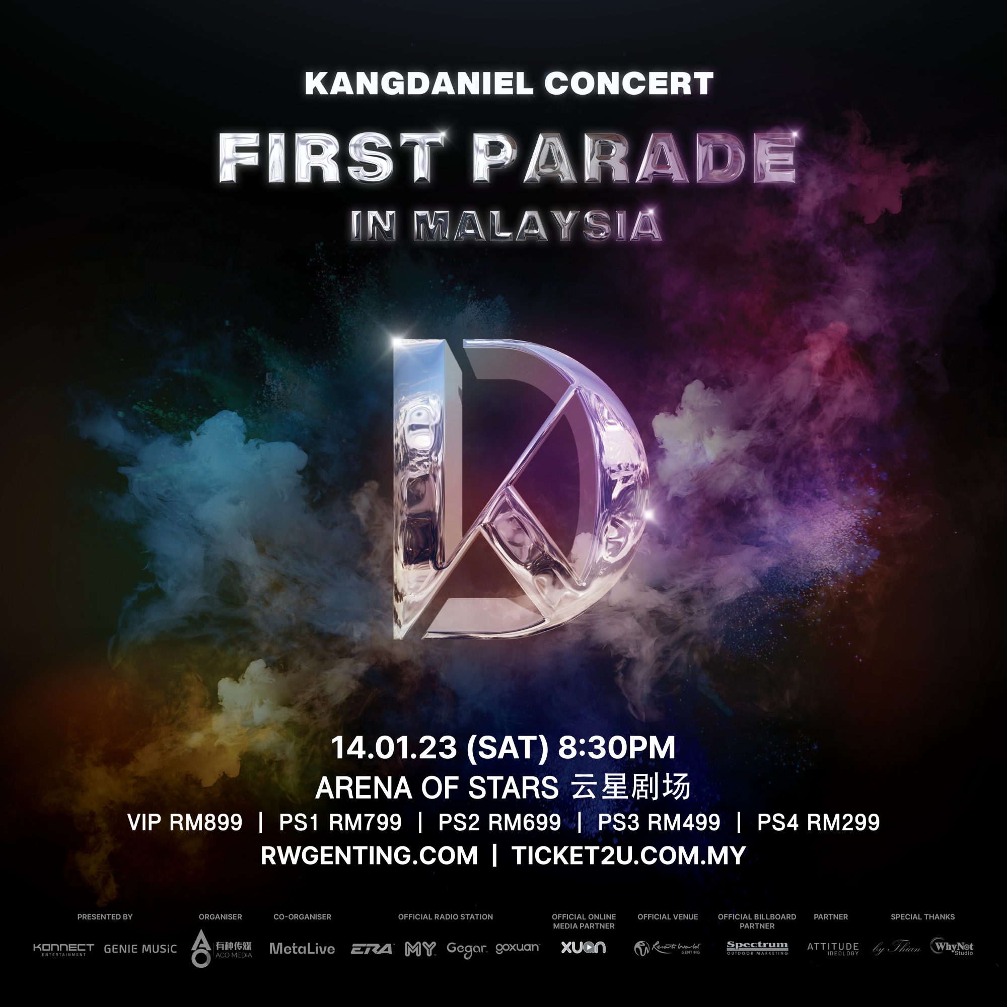 由 KONNECT 娱乐、有种传媒(ACO MEDIA)和 METALIVE WORLD 主办的《KANGDANIEL CONCERT FIRST PARADE IN MALAYSIA》,将于明年1月14日(星期六),晚上8时30分在云顶世界云星剧场引爆。演唱会票价分为899 令吉(VIP)、799 令吉(PS1)、699 令吉(PS2)、499 令吉(PS3)和299 令吉(PS4),所有票价未包含手续费。