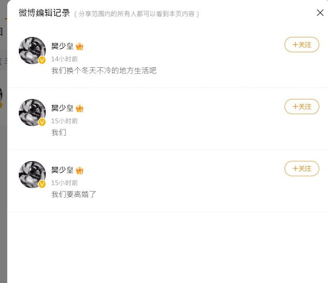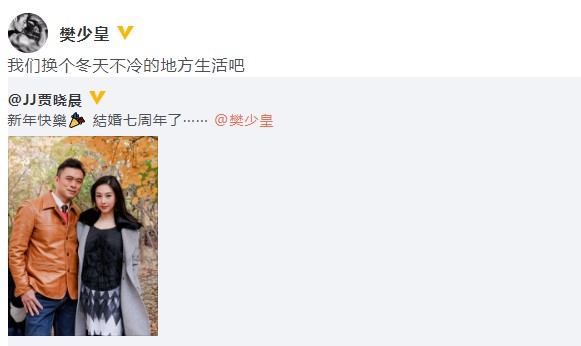 妻子晒照庆7周年 樊少皇转发砸狠话“我们要离婚了” 2 Jan , 2023 | 娱乐前线 敌不过七年之痒?贾晓晨晒出与樊少皇的恩爱合影庆祝结婚七周年,随后樊少皇转发写下“我们要离婚了”爆炸性发言引起网民热议! 港星樊少皇与贾晓晨于2016年结婚,二人育有两名女儿,一家四口一直过着幸福的日子,没想到在2023年元旦,樊少皇竟突然在微博宣布离婚,随后又修改了贴文,此举耐人寻味引发外界揣测。 其妻子在1月1日开心晒出合照庆祝结婚七周年,没想到樊少皇转发写下“我们要离婚了”震撼所有人,不过他随后又多次改了贴文“我们换个冬天不冷的地方生活吧”,让网友雾里看花一头雾水,纷纷好奇他们是否婚变。 分享