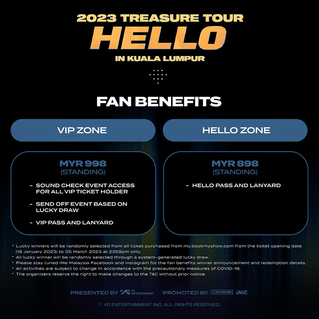此外,主办单位iMe Malaysia也宣布一连串粉丝福利,当中包括出席2023 TREASURE TOUR [HELLO] KUALA LUMPUR彩排活动、演唱会完结后的欢送环节(SEND OFF)和挂绳 (COMMEMORATIVE PASS & LANYARD)。