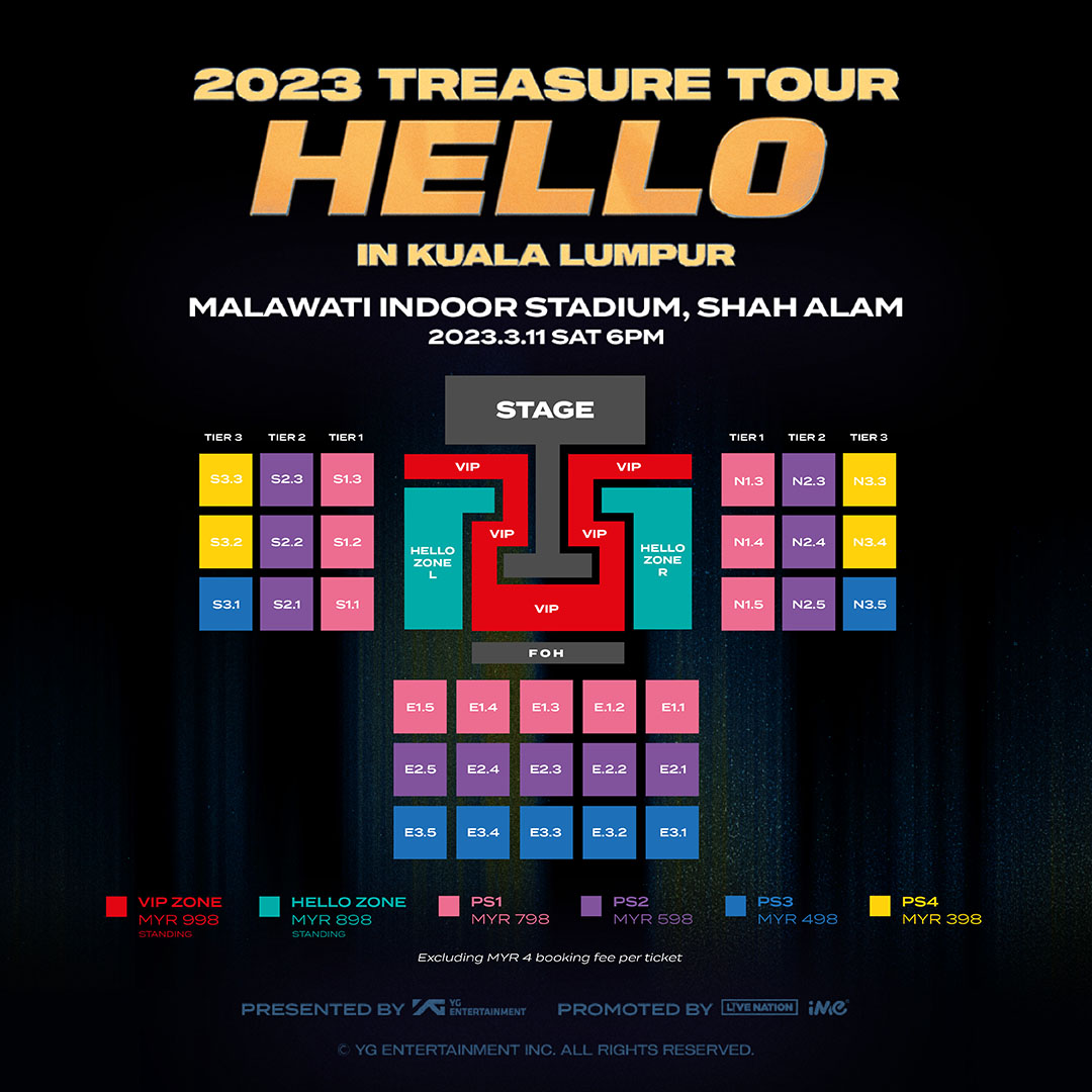 2023 TREASURE TOUR [HELLO] KUALA LUMPUR演唱会主办单位iMe Malaysia宣布大马场落实在2023年3月11日傍晚6点,于莎阿南美拉瓦蒂室内体育馆(Malawati Indoor Stadium)举办。票价分别是RM998、RM898、RM798、RM598、RM498和RM398,票价未包含RM4手续费。