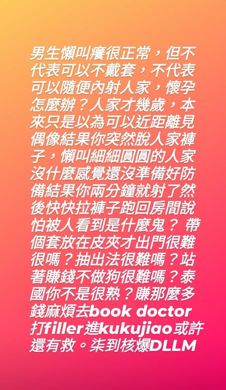 黄明志14日透过IG限时动态发文,橘红色底图配上白色文字写着:“你硬上小妹妹(我朋友)还死命不戴套内射人家。”接着补充“如果被你祖国捉到,你就准备打包去跟牙签做roommate(室友)了。到时候看你还爱不爱祖国……”文中牙签指的是先前因强奸罪遭判刑13年,目前正在坐牢的吴亦凡,加上祖国等字眼,以及文末还使用了一连串的粤语,线索指向香港出身,在中国活动的男艺人。