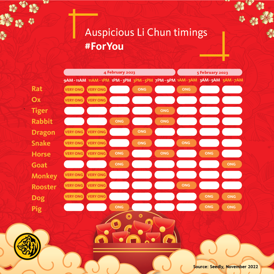 2023年立春之时开始于农历正月十四(阳历2月4日)上午10点43分这时候天地交汇,三阳开泰! 在Maybank所发布的立春存钱表中分为2月4日和2月5日,每个生肖都有最旺(Very Ong)和旺(Ong)的时段!各个生肖可以选择在自己最旺或旺的时段到银行存钱!