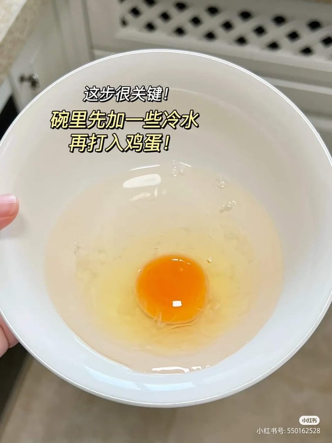 2)水开后关火,等待水面不冒泡,将碗贴着水面缓缓倒入鸡蛋