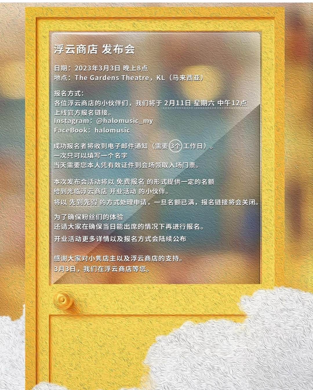 刘隽新歌将在情人节2月14日上线,他在IG与微博官宣将回马举办新歌发布会,从他释放的“浮云商店发布会”海报资料中显示,刘隽将在3月3日于The Gardens Theatre KL晚上8点举办发布会,活动也免费开放让粉丝报名,报名链接将在2月11日线上公布,粉丝们记得留守消息,不要错过这难得的机会咯。