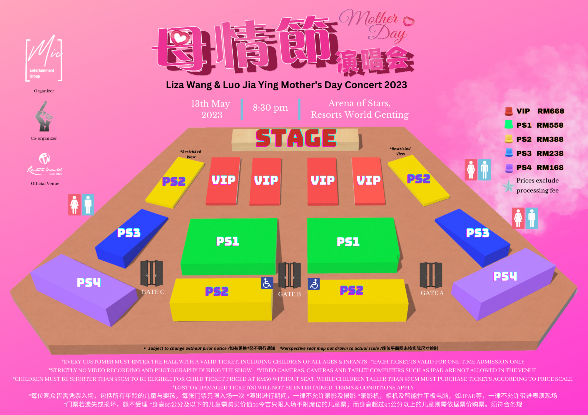 由 MIC 娱乐主办,T.O.P 协办的汪明荃和罗家英《‘爱你不变’母亲节演唱会》,将于 5 月 13 日(星期六),晚上 8 时 30 分在云顶世界云星剧场举行。演唱会票价分为 668 令吉(VIP)、558令吉(PS1)、388 令吉(PS2)、238 令吉(PS3)和 168 令吉(PS4),所有票价未包括 4 令吉手续费。