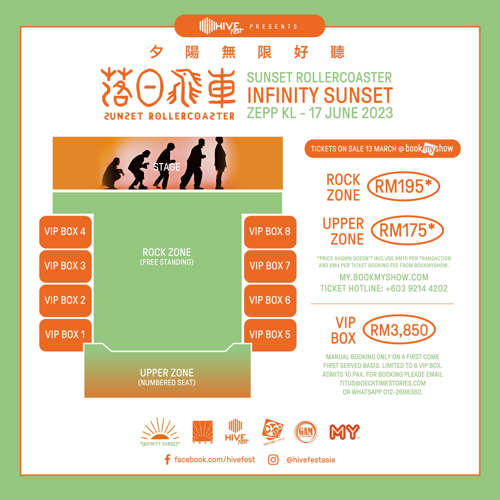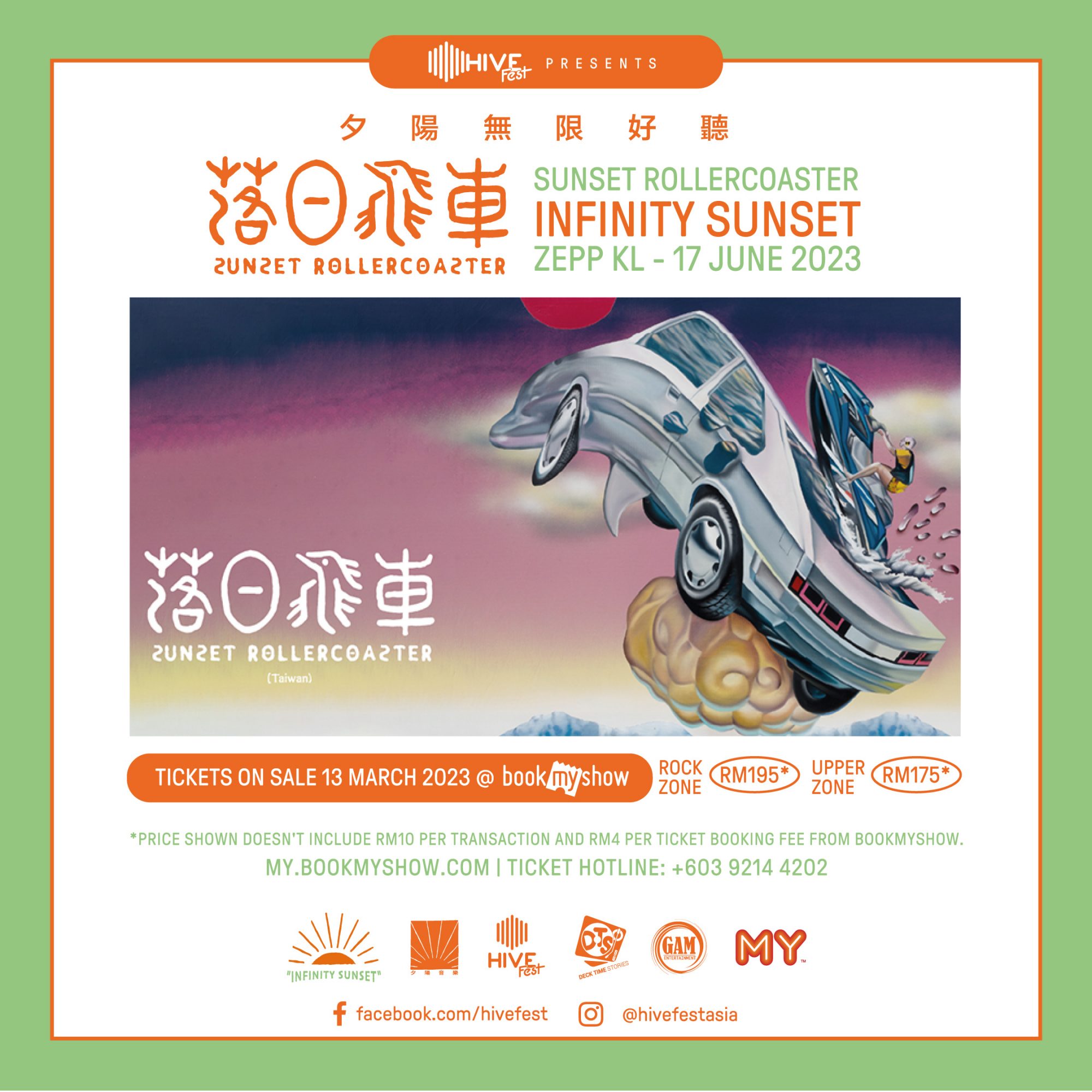 演唱会票价分为 RM175(Upper Zone)和 RM195(Rock Zone)。 “落日飞车-夕阳无限好听”演唱会门票将于 2023 年 3 月 13 日上午 11 时在 my.bookmyshow.com 正式全面公开发售。