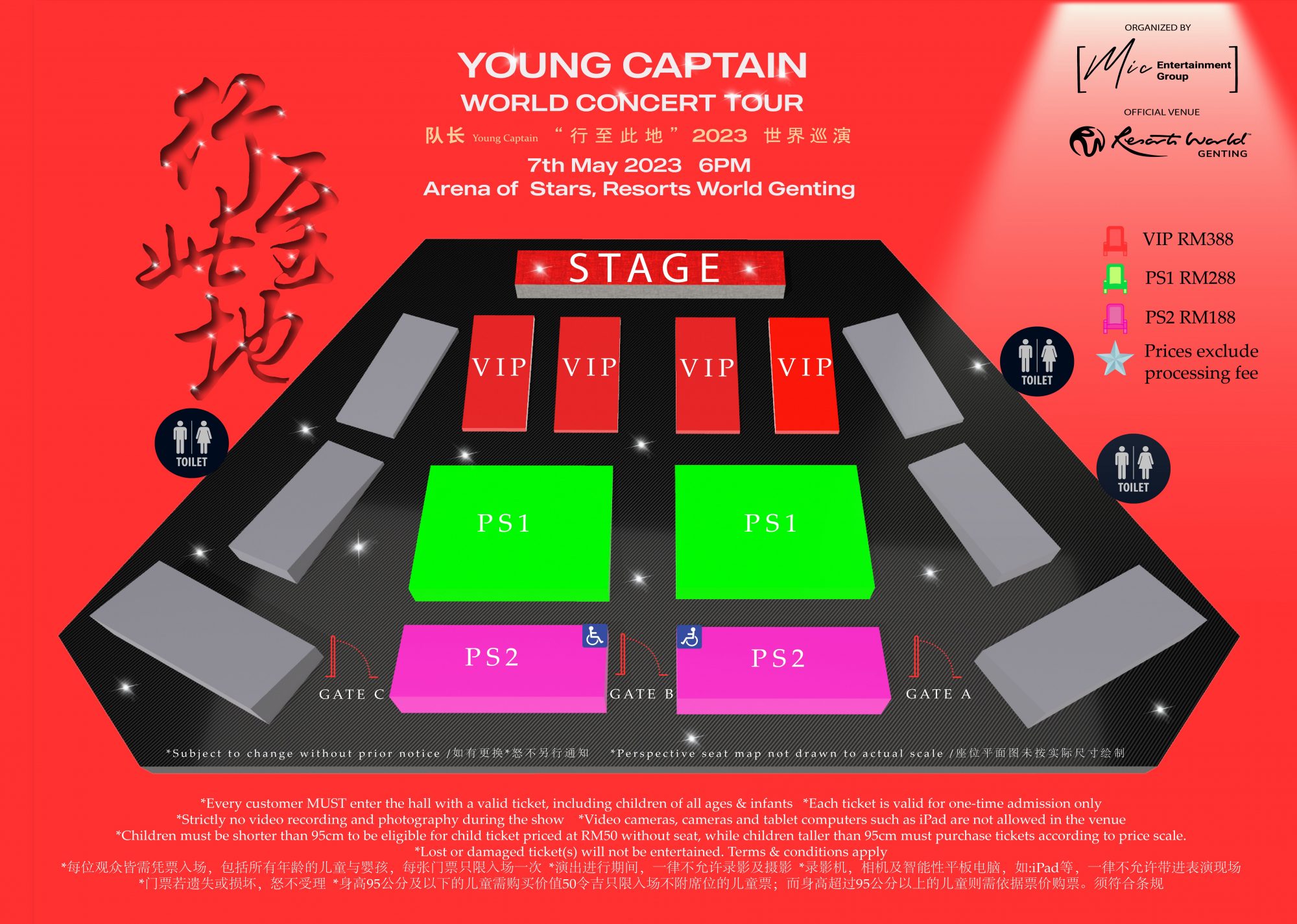 由MIC娱乐主办的《队长 Young Captain 2023 世界巡演‘行至此地’》大马站,将于5月7日(星期日),晚上6时在云顶世界云星剧场举行。演唱会票价分为 388 令吉(VIP)、288 令吉(PS1) 和188 令吉(PS2),所有票价不含 4 令吉手续费。